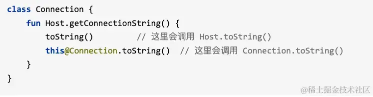 在此种情况下的扩展函数中,倘若派发者和接受者的函数出现冲突,则接受者的函数的优先级要高于派发者的函数,倘若当前想要指明使用派发者的函数则可以通过带限定符的this(就是通过限定符指明当前的this指向那一个对象)指明函数属于派发者的函数,即this@派发者.函数。