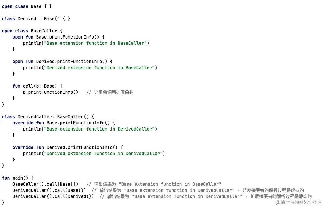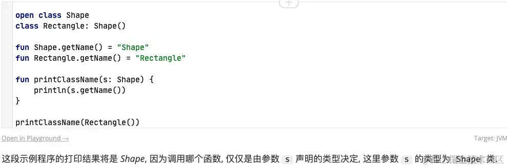 扩展函数的使用具体调用那个扩展函数,取决于调用的这个扩展函数所述的扩展类,即扩展函数的直属扩展类,比如父类和子类两个都扩展了同一个名称的扩展函数,外部使用的时候的扩展函数取决于扩展类是父类还是子类,即扩展函数是扩展类的静态函数。