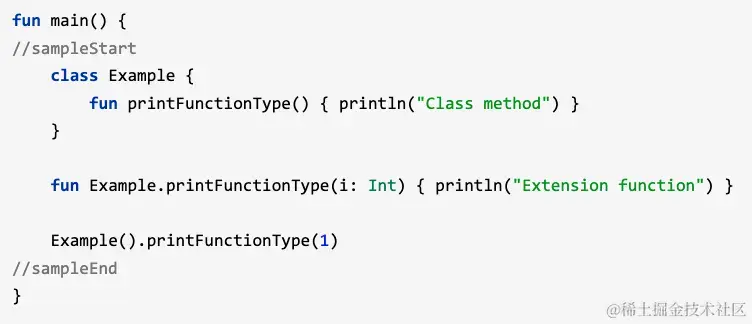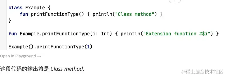 扩展函数和扩展类的成员函数是同一个函数的时候,扩展函数失效,扩展类的成员函数优先级大于扩展函数,但是可以同一个函数名不同的参数重载扩展函数。