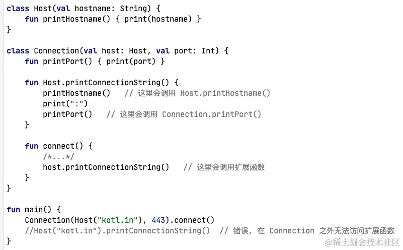 - 顶层声明 的扩展函数可以访问顶层属性和顶层函数,成员类中声明的扩展函数可以访问成员类中的函数和属性。