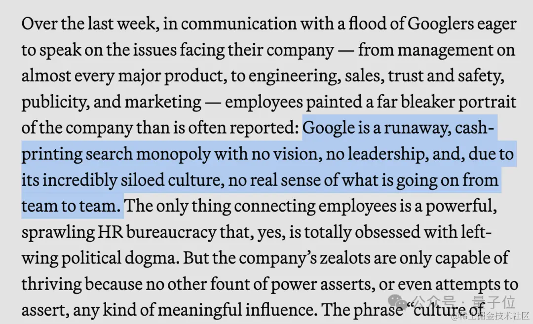 谷歌是一个失控的、印钞机式的搜索垄断企业,没有愿景、没有领导力,并且由于其难以置信的孤岛式文化,团队之间真正的情况了解甚少。