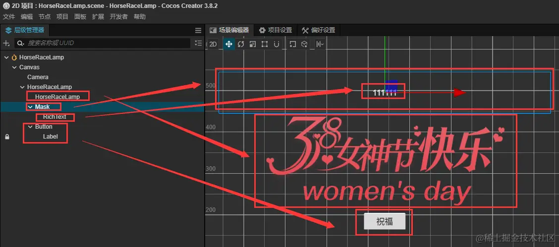如图所示,把小姐姐给的图片拖到场景中去,然后添加一个按钮用于测试触发跑马灯,再添加一个Mask组件和RichText组件。