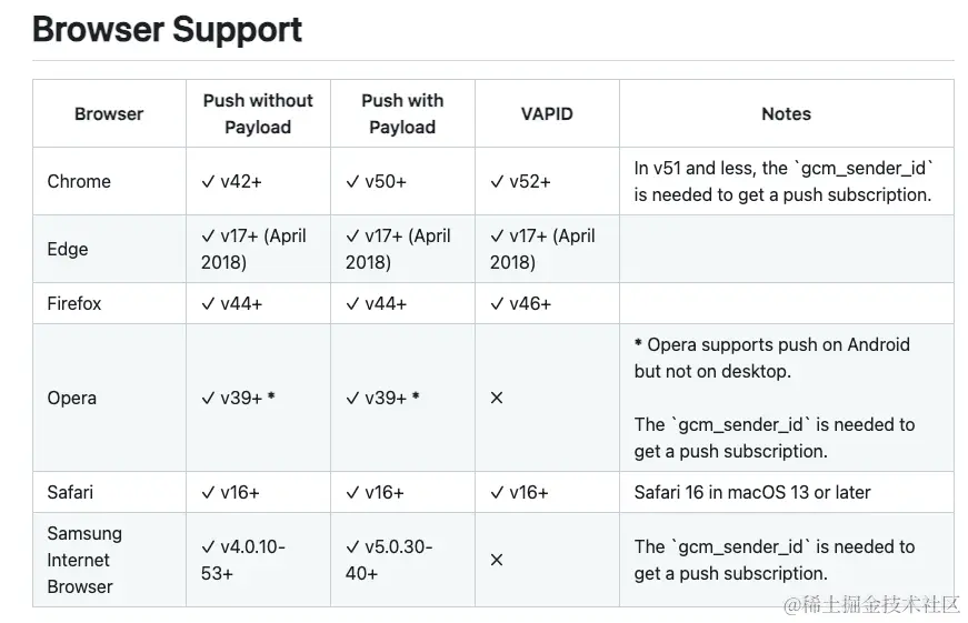 - 技术限制:在国内,由于网络环境和网络规则的特殊性,使用 web push 技术的应用受到了一定的限制。例如,一些浏览器可能不支持或者只部分支持 web push 功能,这就限制了这项技术的普及和使用。