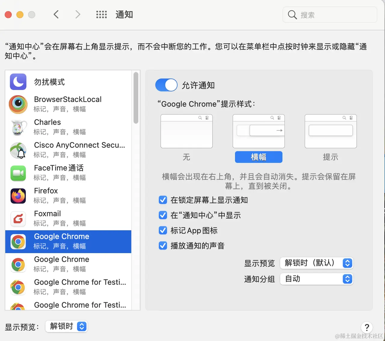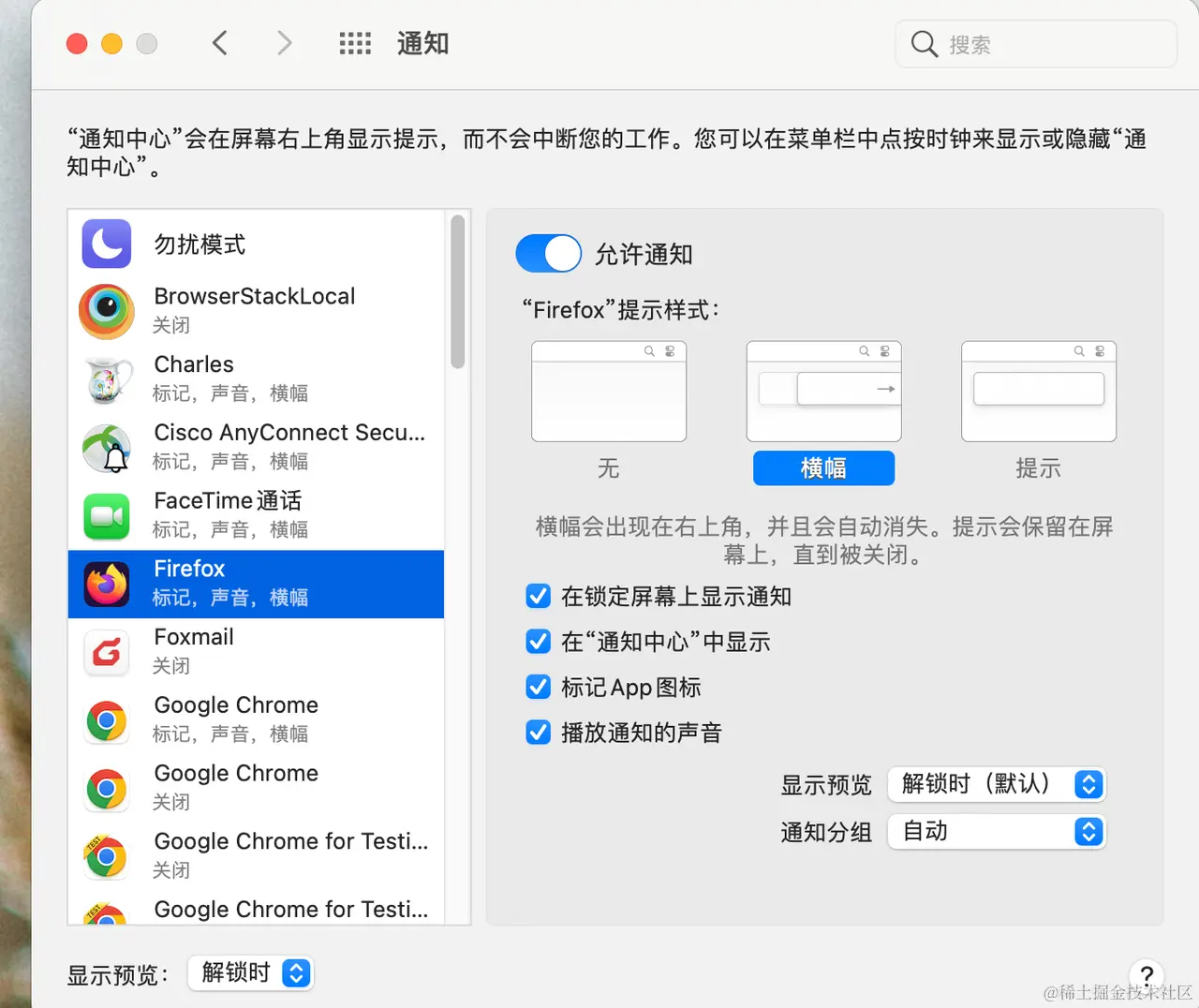系统偏好设置 => 通知=> firefox\Chrome