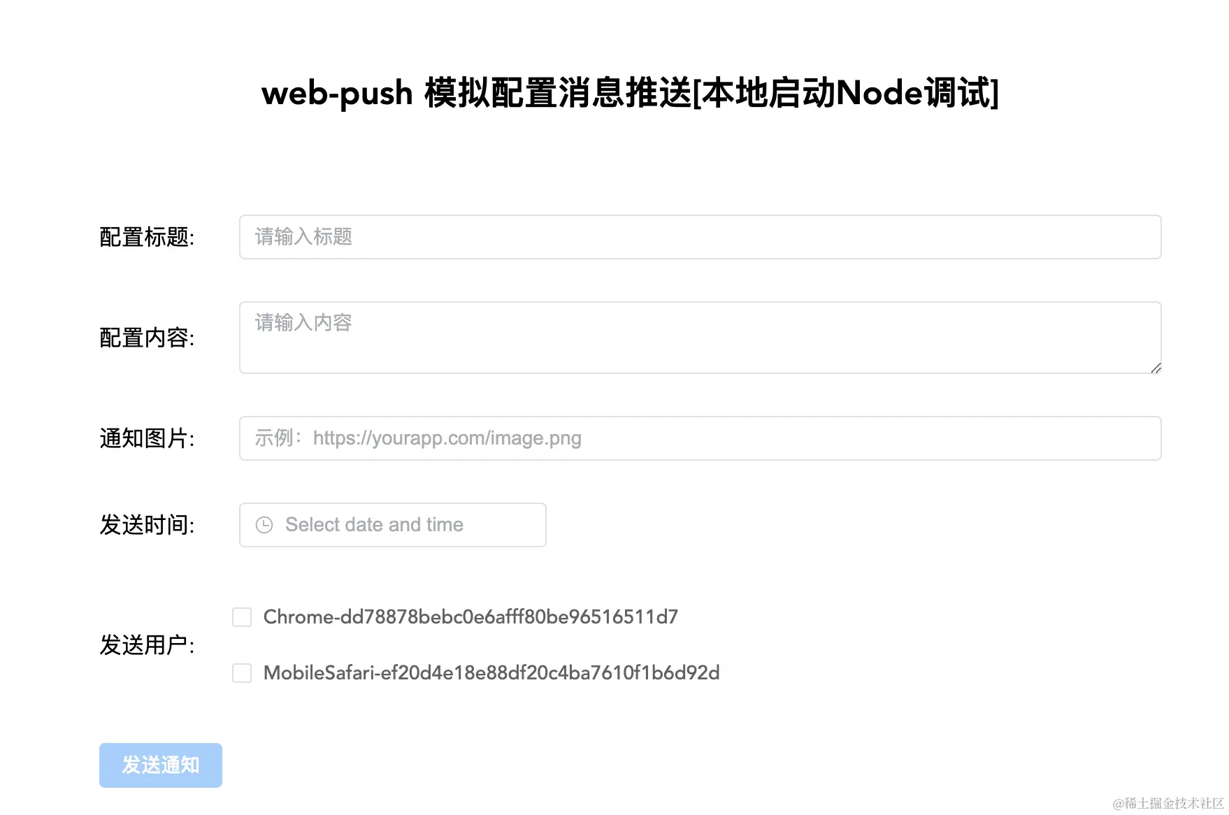 技术栈这边根据自己喜欢搭建满足下图选项即可,我这里使用的是vue-cli直接生成,通过下图可以看到在「发送用户」里面的数据就是由 /push/notice-users 进行查询,发送的时候使用/push/config-message 进行发送通知