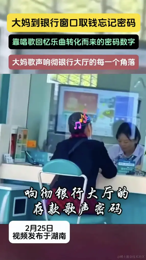 网传一银行用户因遗忘密码,在大厅通过唱歌进行回忆(源自网络)