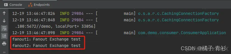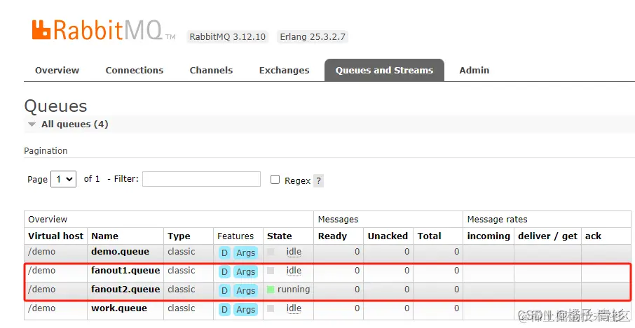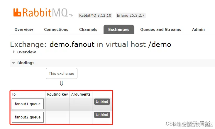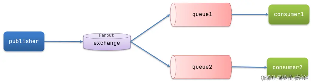 - 功能:将消息发送给所有绑定到交换机的队列。这意味着,无论队列是否订阅了消息,只要它们与交换机绑定,它们都会收到消息。