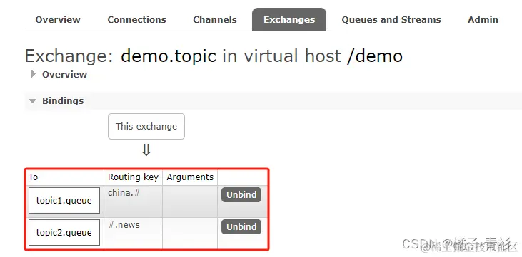 - 示例:假设有两个队列A和B,A订阅了"key.#"的消息,B订阅了"key.*"的消息。如果有一个Topic交换机,并且它接收到一条RoutingKey为"key.test"的消息,那么这条消息会被发送到A和B两个队列。