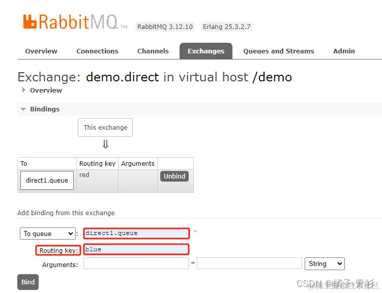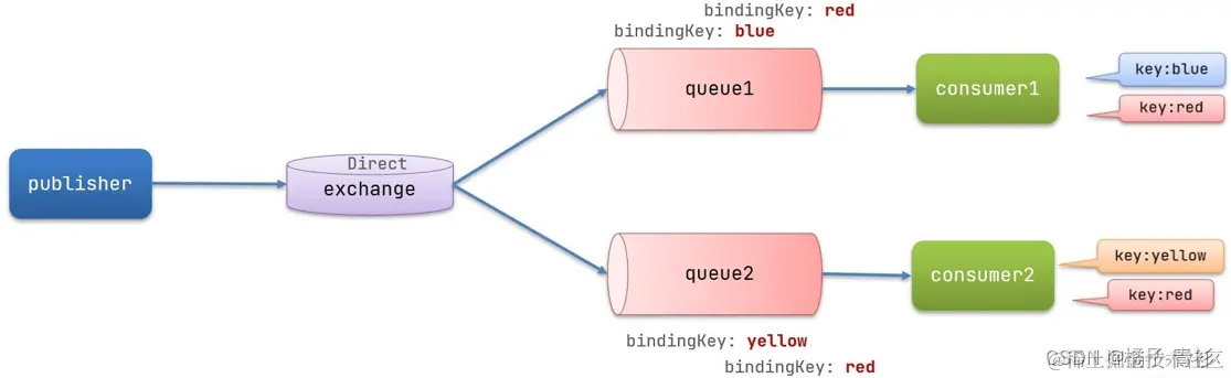 - 队列与交换机的绑定:在Direct模型下,队列与交换机的绑定不再是任意的。当队列绑定到交换机时,必须指定一个**