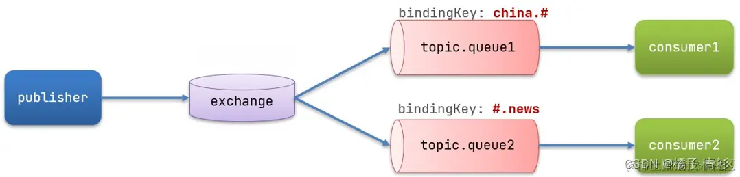 RoutingKey。这个RoutingKey**可以包含通配符,以便在多个队列之间进行匹配。 - 交换机和路由决策:在Topic模型中,交换机会查看每个消息的**