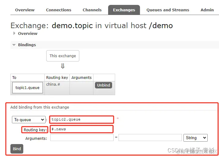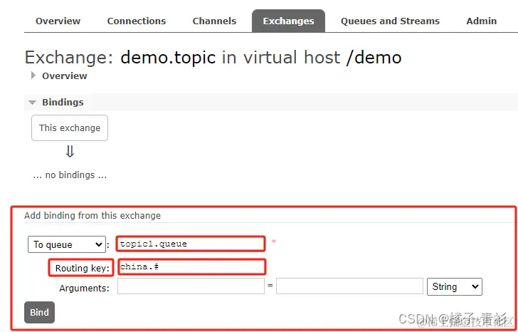 - 队列与交换机的绑定:在Topic模型下,队列与交换机的绑定仍然需要指定一个**