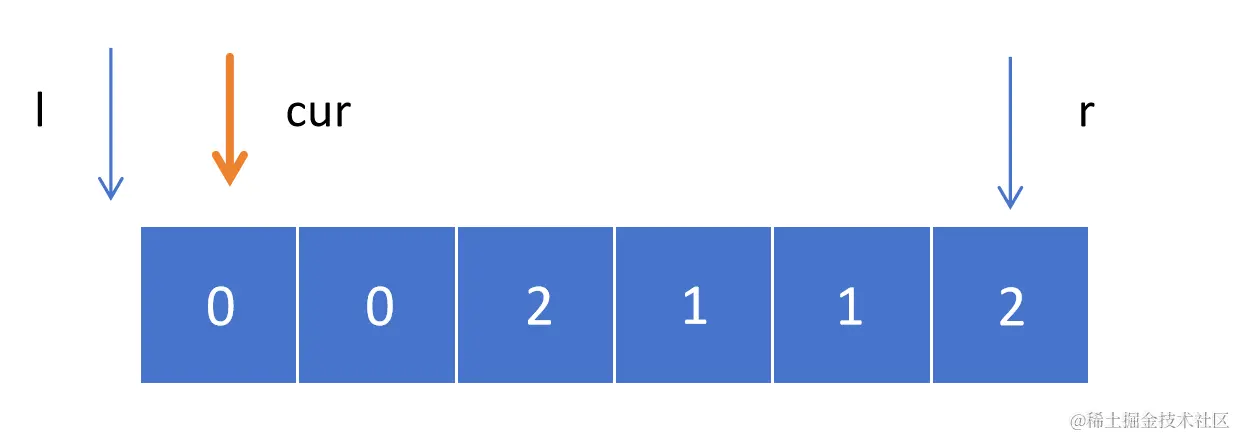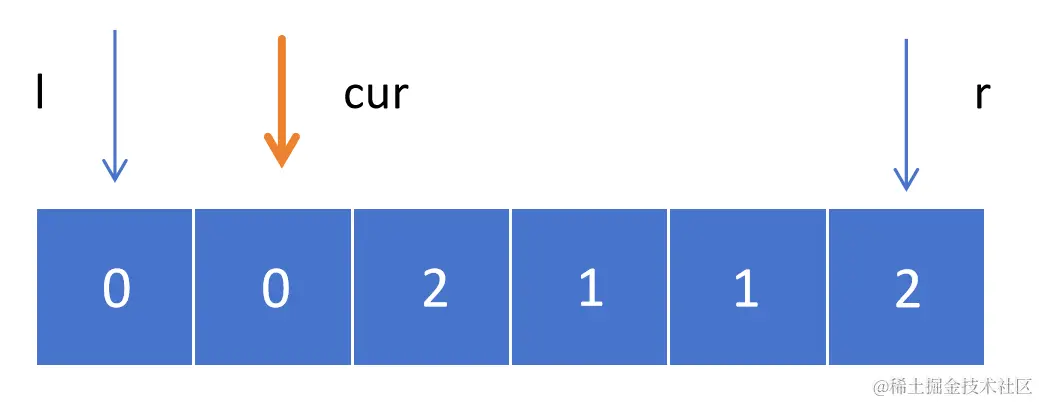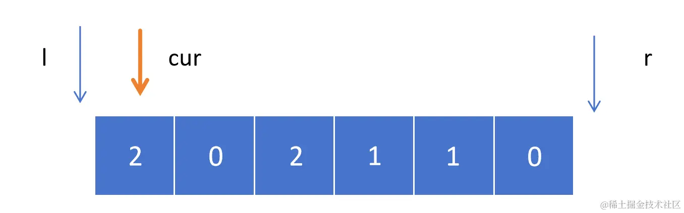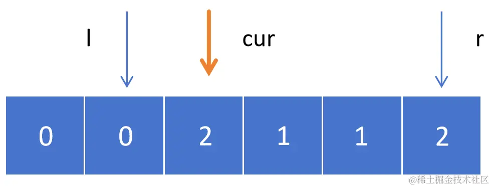 初始情况,l = -1,cur = 0,r = 6,我们需要在 cur 遍历的过程中始终保持 [0, l] 满足小于 1,[r, 5] 满足大于 1。