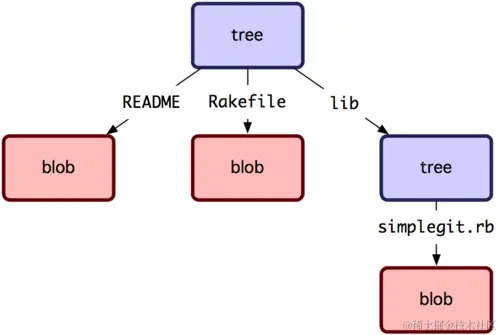 tree 对象可以存储文件名,同时也允许存储一组文件。Git 以一种类似 UNIX 文件系统但更简单的方式来存储内容。所有内容以 tree 或 blob 对象存储,其中 tree 对象对应于 UNIX 中的目录,blob 对象则大致对应于 inodes 或文件内容。