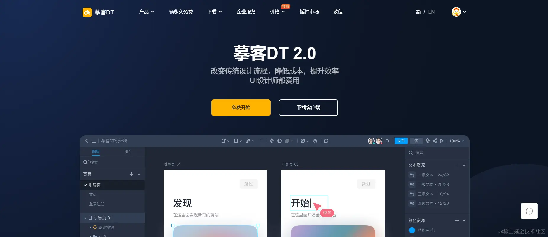 **推荐理由:**摹客DT,是一款更适合中国设计师的UI/UX设计工具。与一些老牌设计工具(Photoshop、XD等),它的学习门槛更低,上手更简单,社区和实时客户支持更迅速友好;作为Web端工具,摹客DT支持多人实时编辑,大大提高了团队设计效率。