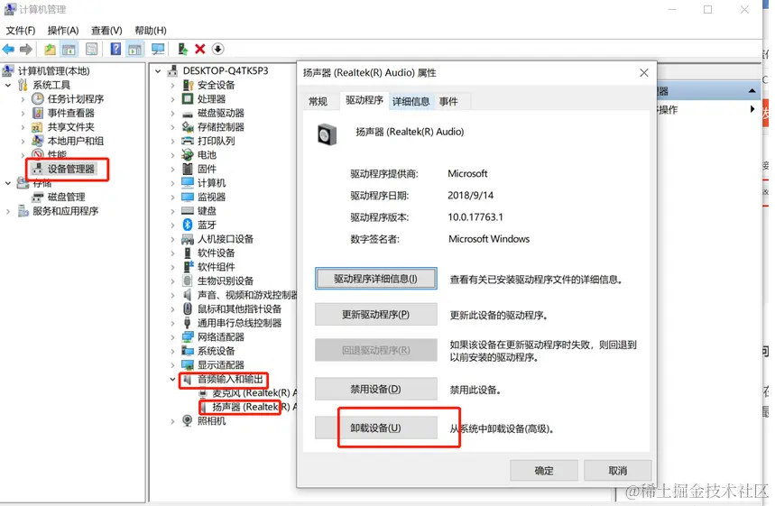 选择此电脑-右键属性,设备管理器-音频输入和输出。如果是播放器没有声音就卸载扬声器,如果是麦克风没有声音就卸载麦克风,然后重启电脑。