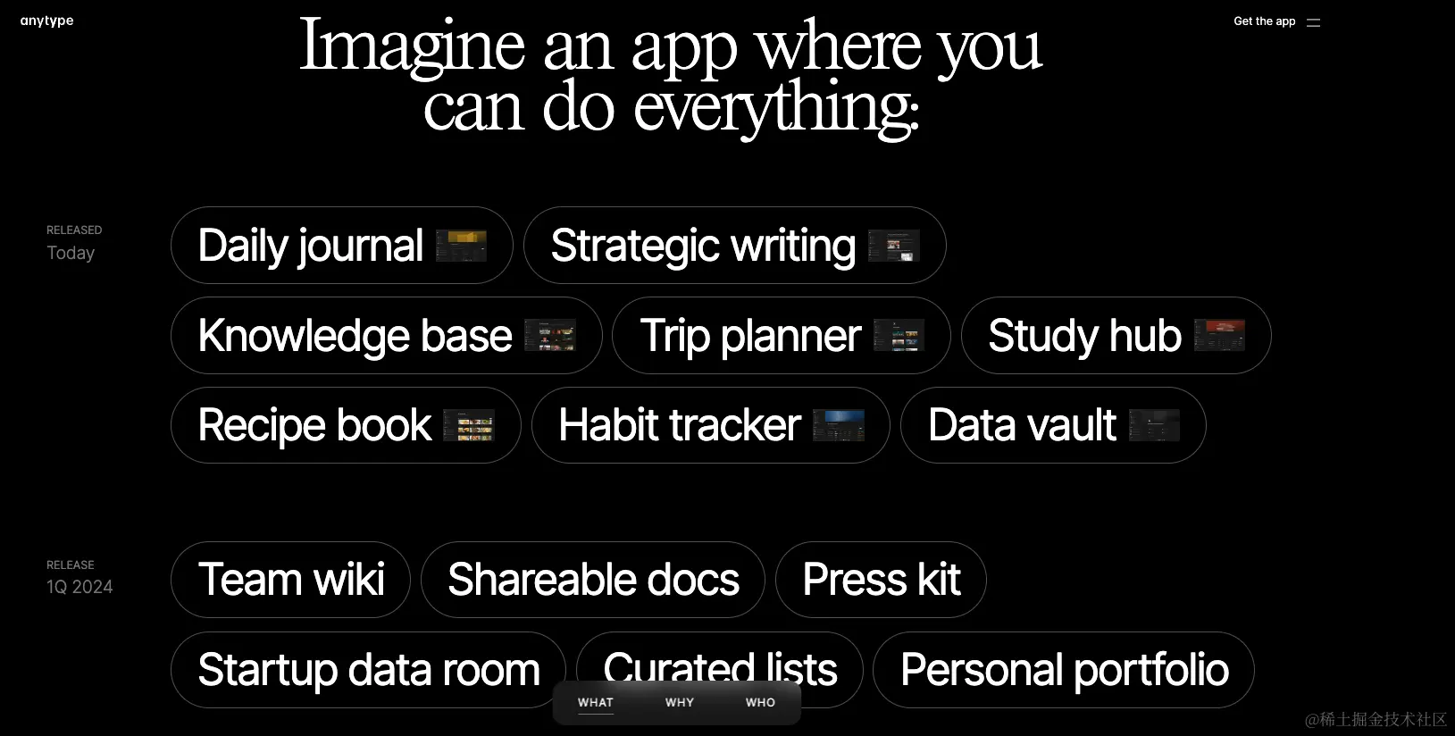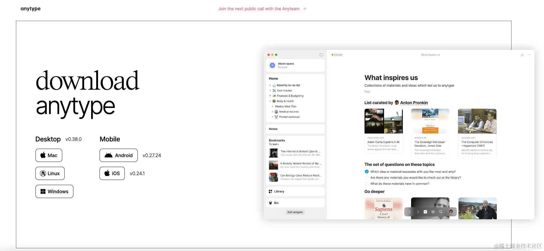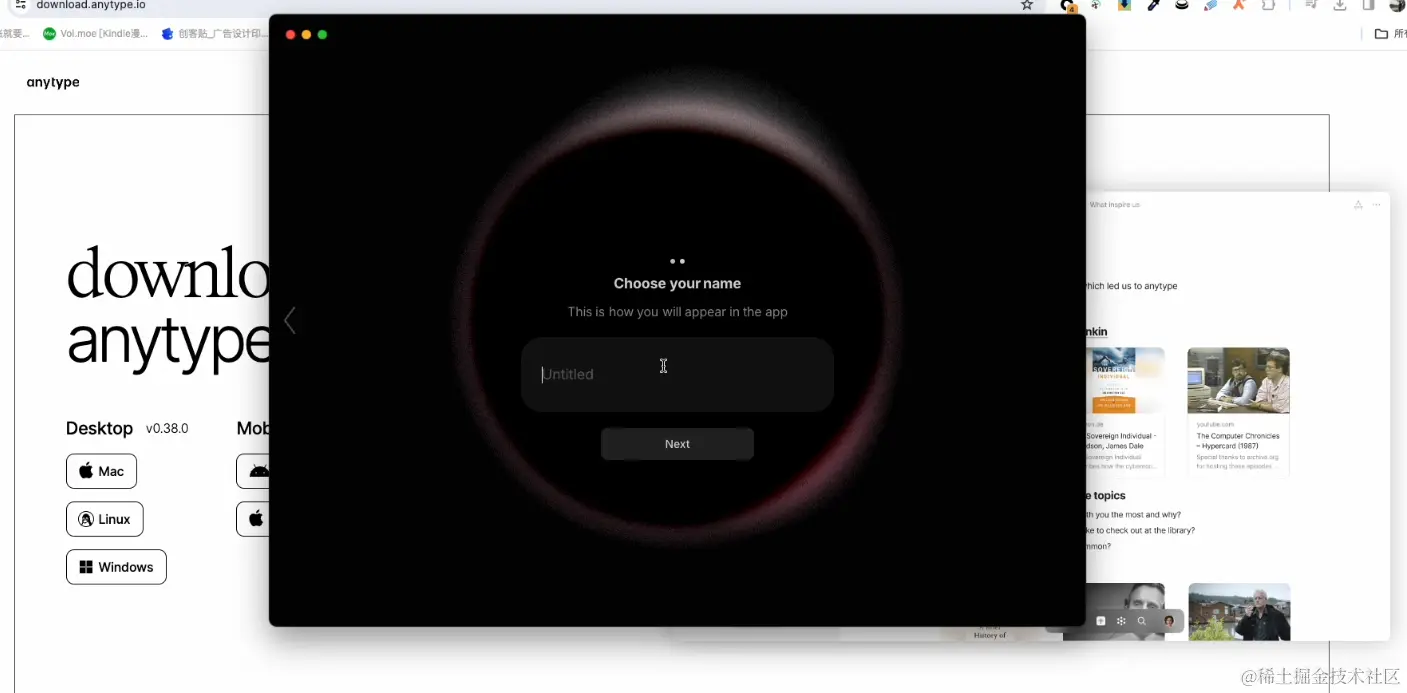 Anytype 桌面版支持Mac、Linux、Windows,移动版支持IOS和安卓。可以直接在官网的下载页下到对应的安装包。