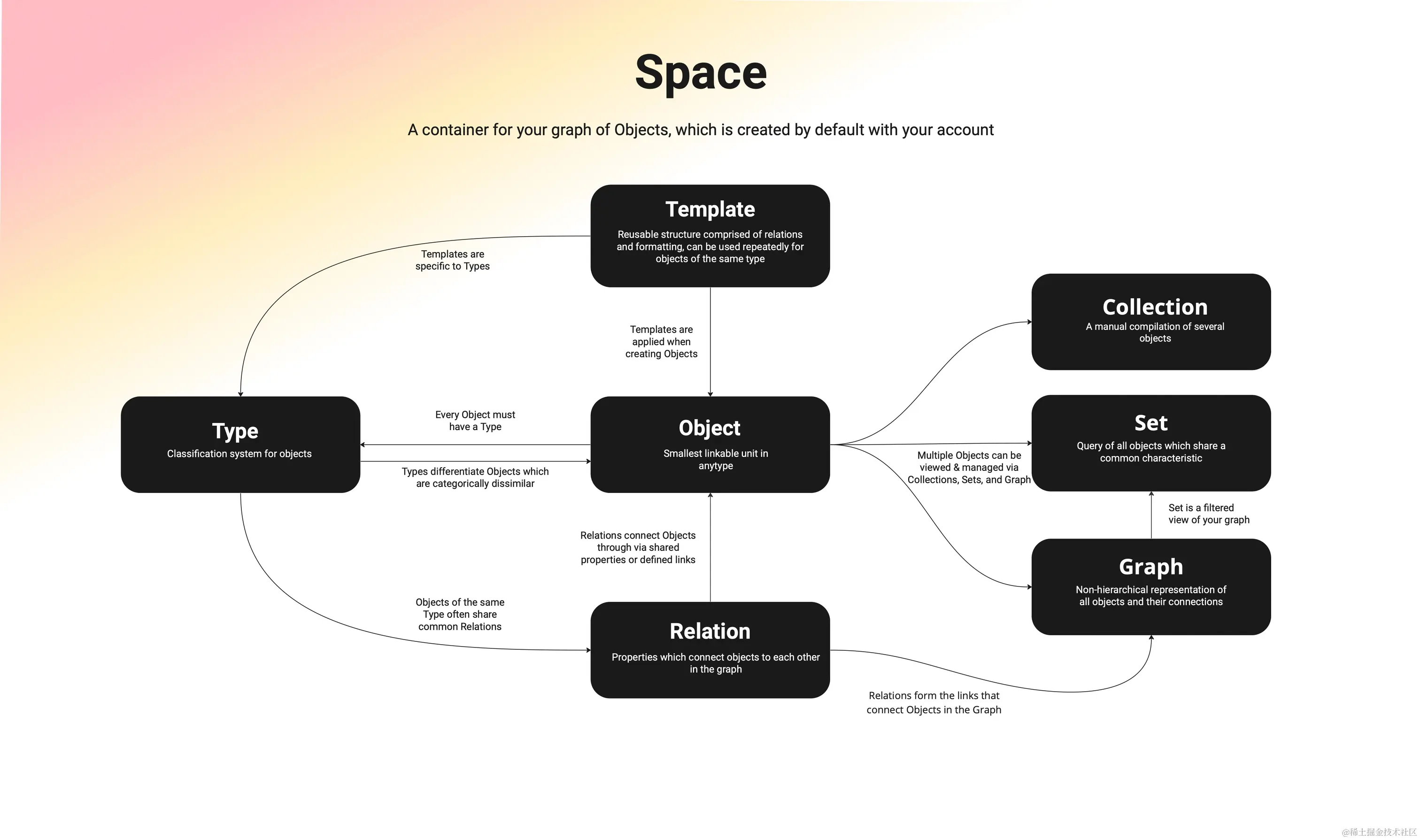 Anytype由空间(Space)、关系(Relation)、类型(Type)、对象(Object)等概念组成,空间内的关系、类型、对象都独属于空间,不与其他空间相混淆。先有一个基本的概念,更容易理解它的内容。