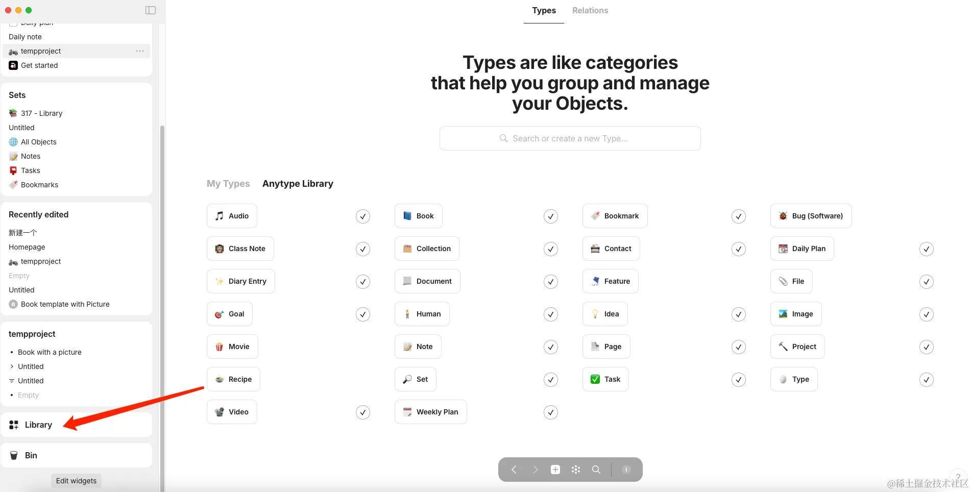 下面这张图比较直观的说明了Anytype里面各种概念间的关系。每新建的东西都是一个对象,可以是页面、人、文章、目标、网页标签等等。每个对象都是图上的一个点,每个对象都必须赋予一个类型,各种对象之间可以建立关系。