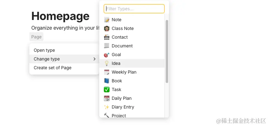 这里可以看到,新建的笔记的type是page,同样可以切换笔记的type。