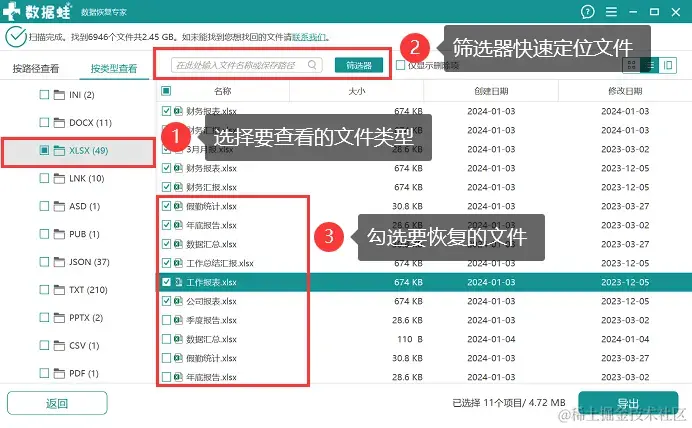 第4步:确保所有需要恢复的文件都勾选上后,点击 【导出】 ,并先将导出后的文件先保存在电脑的任意磁盘上,检查文件能正常查看后,再将其复制到u盘上。