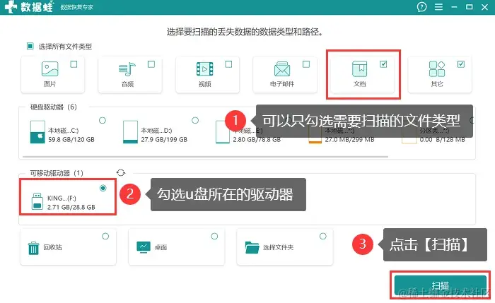 第2步:进入软件的扫描界面后,用户可以先勾选上需要扫描的文件类型,再勾选上u盘,点击【扫描】 ,软件将一键安全扫描u盘;
