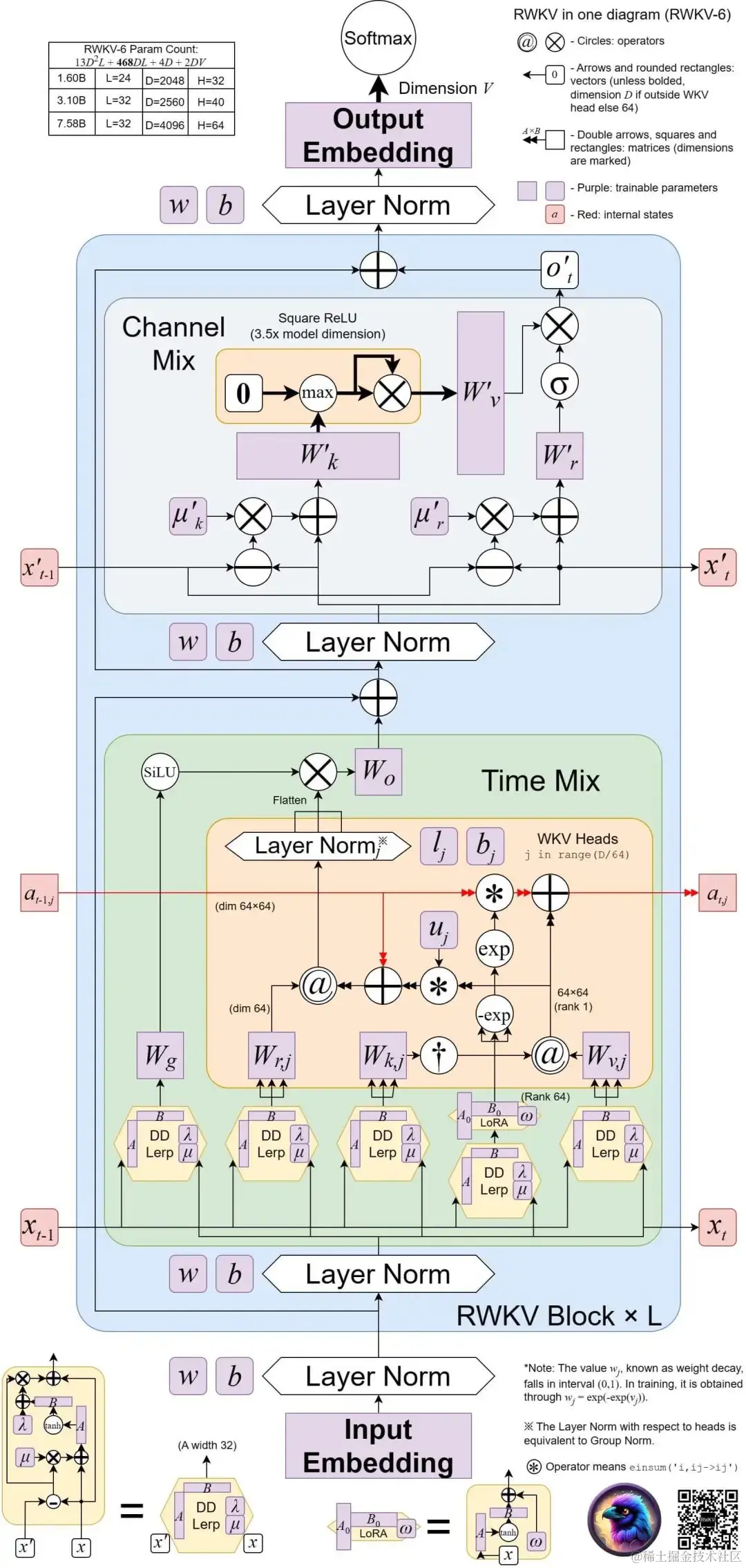 RWKV 模型的最新版本是 RWKV-6 ,架构图如下: