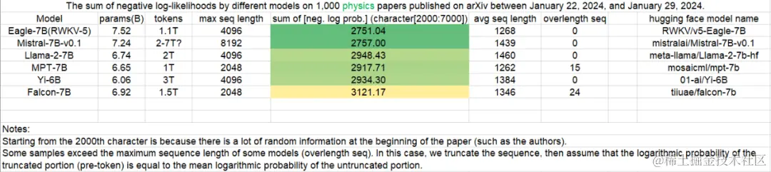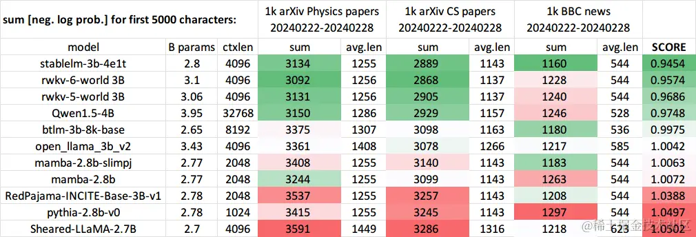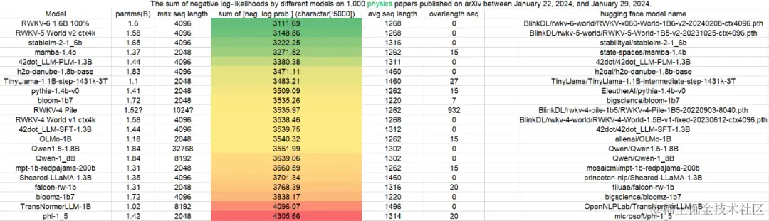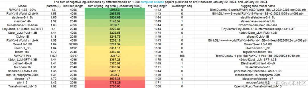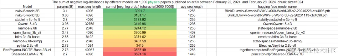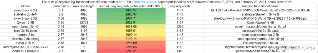 在最新一期针对 3B 参数规模模型的 Uncheatable Eval 基准测试中,我们很开心地看到:在最新的 arXiv 论文测评中(无论是物理还是计算机科学方向),RWKV 模型最新的第六代架构 “RWKV-6” 的表现都非常好,在基准测试中博得头筹。
