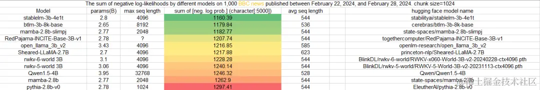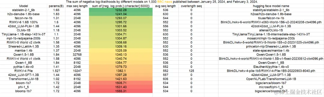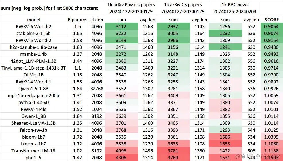 下面是一些旧的测试结果,与最新的 Uncheatable Eval 代码相比,下图使用的测试方法略有不同。