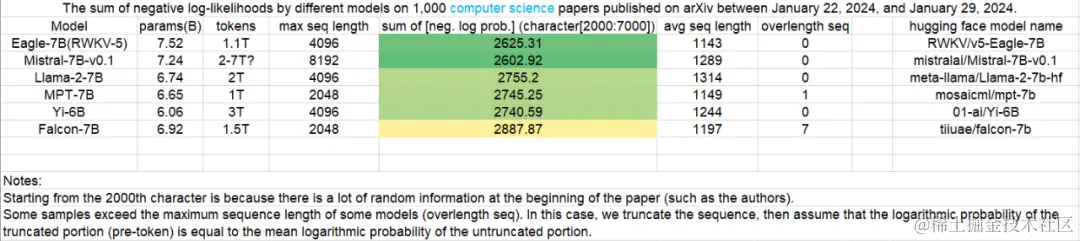 可以看到,在往期的测试结果中,无论是 1.5B 还是 7B 参数规模, RWKV 模型都保持着非常优秀的表现。