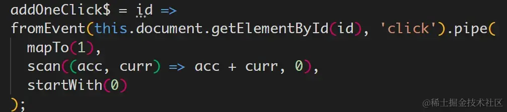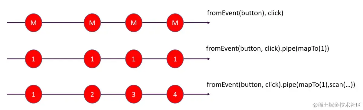 Observable 对象的 pipe 方法,支持传入各种操作符 (Operators),比如上图第二根横线所示的 pipe(mapTo1(1)). 这个操作的语义是,将用户点击按钮时释放出的 MouseEvent 对象,映射成常数 1. MouseEvent 对象包含了用户点击事件的明细,比如发生点击的时间戳,点击时鼠标的 X 和 Y 坐标等等。然而我们的需求仅仅是统计点击次数,所以使用 mapTo(1), 将 MouseEvent 对象映射成 1 进行计数即可。然后再使用 Scan 操作符,这个操作符接收一个累加函数作为输入值,能在其内部维护累加值,实现计数的需求。