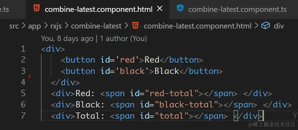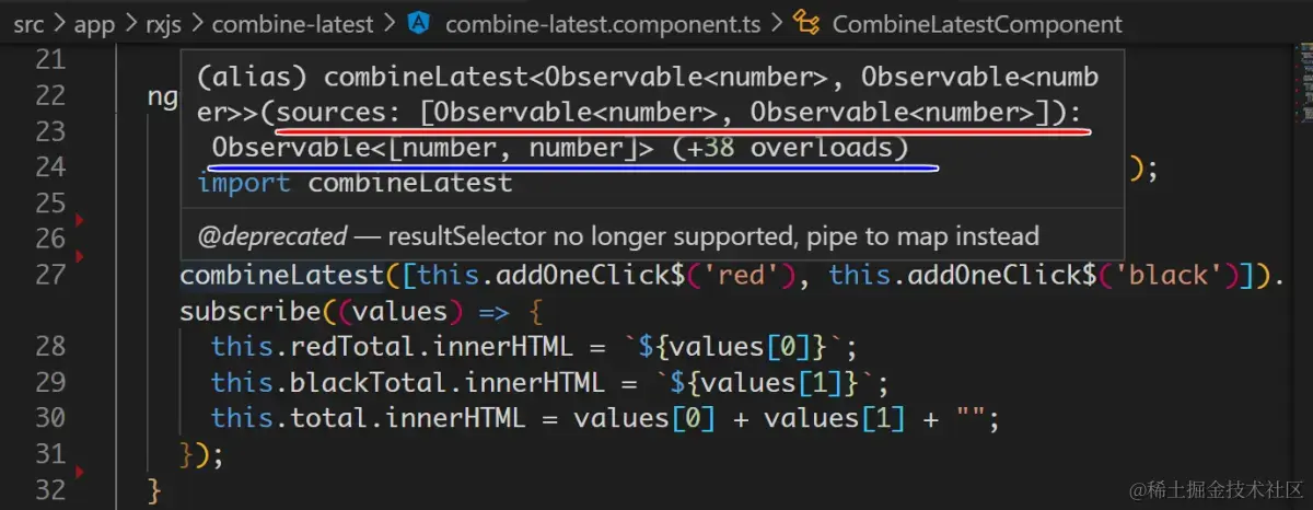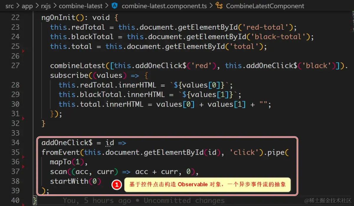 在本文例子里,Red 按钮和 Black 按钮点击事件对应的 Observable 对象,被 combineLatest 加工,返回的联合异步事件对象,再被下图第 28 行的匿名箭头函数订阅。传入该匿名对象的输入参数 values 是一个数组,包含两个元素,值分别为当前 Red 和 Black 按钮总的点击次数。这些总的点击次数,就是通过前面描述的 Observable pipe 方法里传入的 mapTo 和 scan operator,基于按钮点击产生的 MouseEvent 加工后生成的值。而 values 数组里两个元素之和,即为当前按钮总的点击次数。因此代码 28 ~ 30 行,依次将 values 数组中的元素,赋给 red,black 和 total 三个计数器的 innerHTML 属性,完成界面渲染。