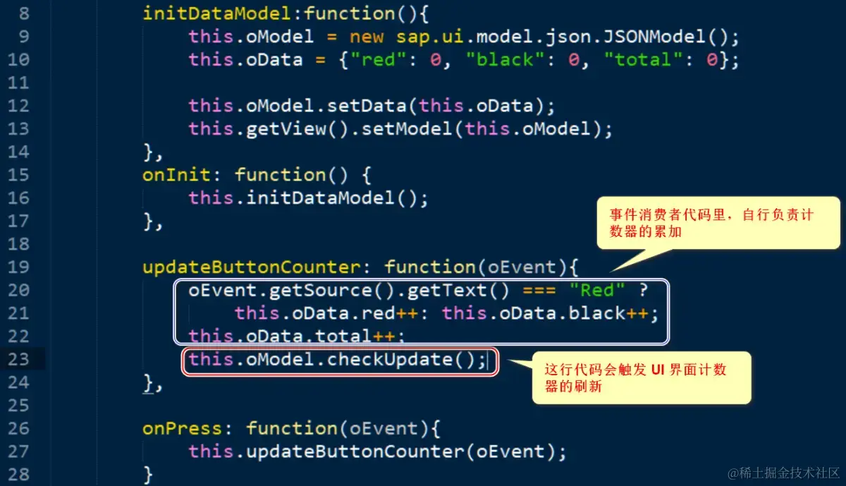 我给视图控制器绑定了一个 JSON 模型,里面包含了 red, black, total 三个属性,分别绑定到 XML 视图的三个计数器里。当两个按钮被点击时,触发 Press 事件,对应的处理函数 onPress 被调用,在函数内更新对应计数器的值。