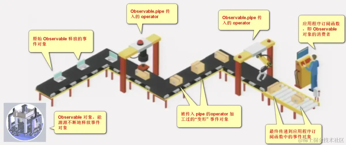 可以把 Observable,Operator,Observable 释放的事件对象,以及订阅 Observable 的处理函数,分别类比成现实中流水线传送带上待加工的零件,以便于理解。