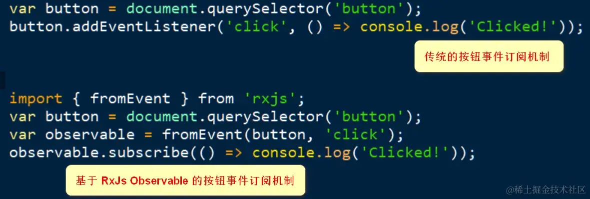 比较下图,传统的采取 addEventListener 实现的按钮事件订阅机制,以及基于 RxJs Observable 两种实现方式的比较。