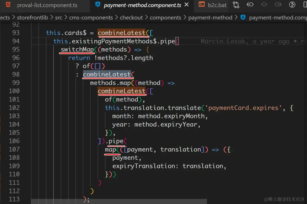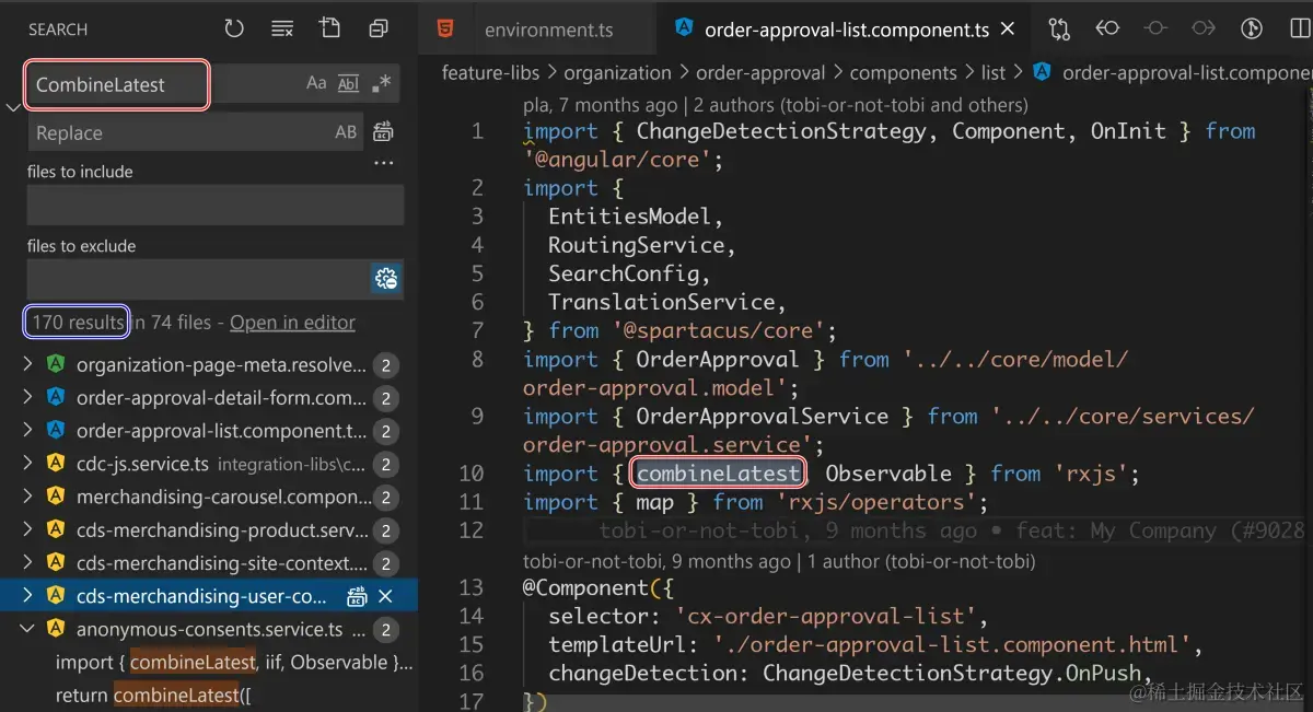 在 SAP 电商云源代码里根据关键字 CombineLatest 进行搜索,得到 170 条搜索结果。这说明其在 SAP 电商云前台开发里使用是相当广泛的。