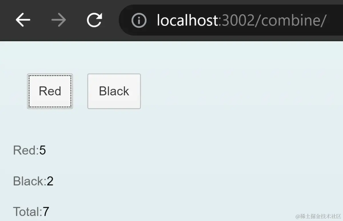 下图状态表明,当前 Red 按钮被点击 5 次,Black 按钮被点击 2 次。