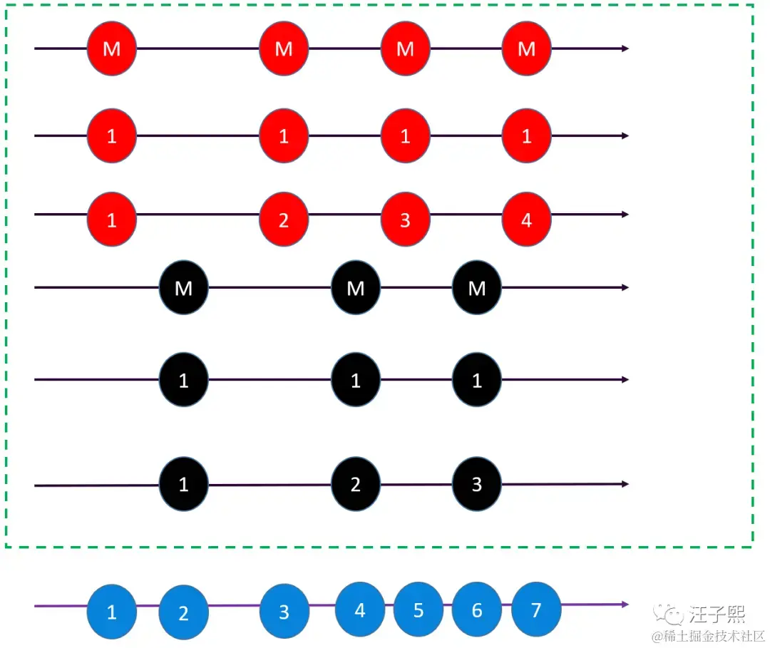 下图绿色虚线方框所示的联合异步事件对象,代表了用户点击 4 次 Red 按钮,3 次 Black 按钮之后,该对象释放出的 MouseEvent 和其被 Operators 处理的过程。下图底部紫色横线和蓝色的图例,代表了任意一次用户点击按钮之后,total 计数器值的计算逻辑:即当前两种按钮总的点击次数求和。