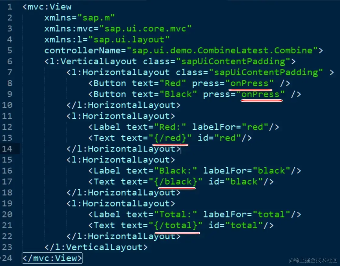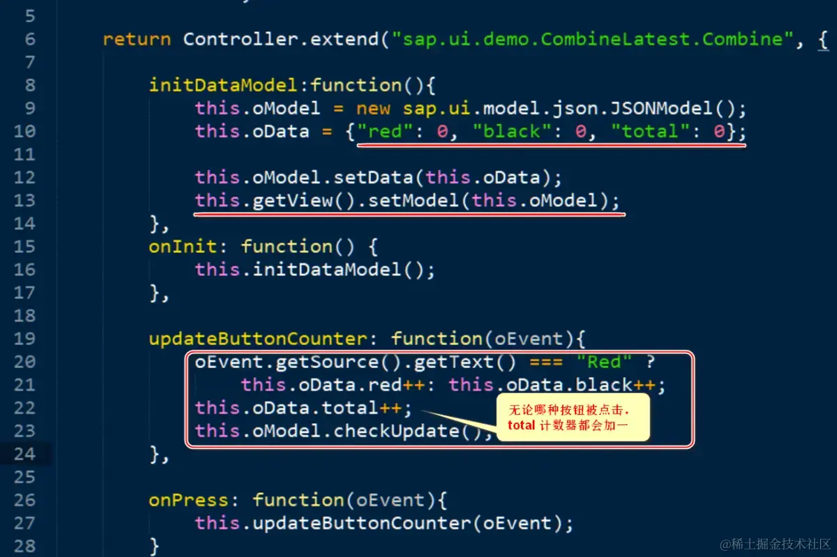 首先用 SAP UI5 实现该模型。绘制一个 Red 和 一个 Black 按钮,点击后,其各自的计数器加一。同时,还有第三个计数器 Total,无论哪种按钮被点击,这个 Total 计数器也加一。