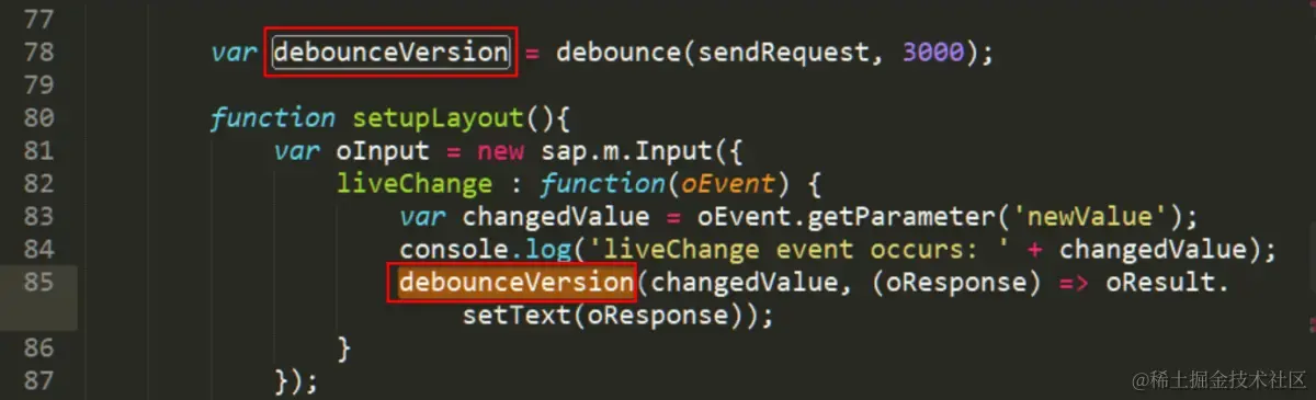 SAP UI5 实现函数防抖思路类似,只是需要应用开发人员自行编写防抖函数: