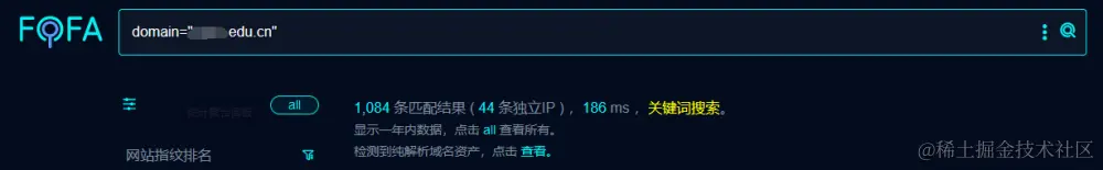 第一步当然是从信息收集开始,因为通常主域名基本不会含有高危漏洞。可以通过子域名->子域名端口扫描的方式去进行一个信息收集用来提高攻击面。这里是用fofa进行攻击面的扩大。(如果fofa脆弱系统较少可以自己爆破子域名+端口1-65535扫描的方式去进行渗透测试)。