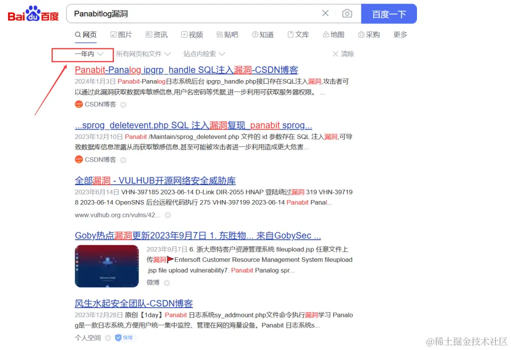 然后建议百度搜索时间设置为一年内,可以省不少时间实际测试感觉一年之前的漏洞修复概率比较高。(可能是一年一次hvv的原因?)