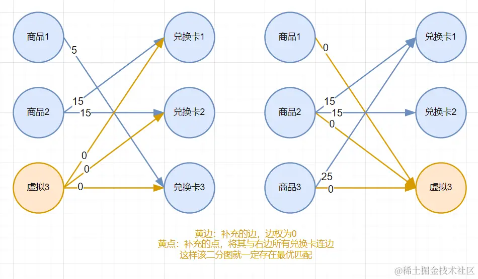 我们把商品当作女生,兑换卡当作男生,商品 i 使用兑换卡 j 的优惠金额是 W(i,j) 去构建二分图,如果商品 i 不能使用兑换卡 j,则优惠金额设为零,以此方式,我们会遇到一些问题: