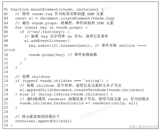- 为元素添加属性和事件:遍历 vnode.props 对象,如果 key 以on 字符开头,说明它是一个事件,把字符 on 截取掉后再调用toLowerCase 函数将事件名称小写化,最终得到合法的事件名称,例如 onClick 会变成 click,最后调用addEventListener 绑定事件处理函数
