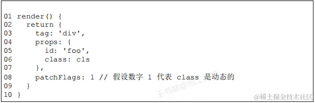 - 渲染器看到这个标志时就知道:只有 class 属性会发生改变。对于渲染器来说,就相当于省去了寻找变更点的工作量,性能自然就提升了