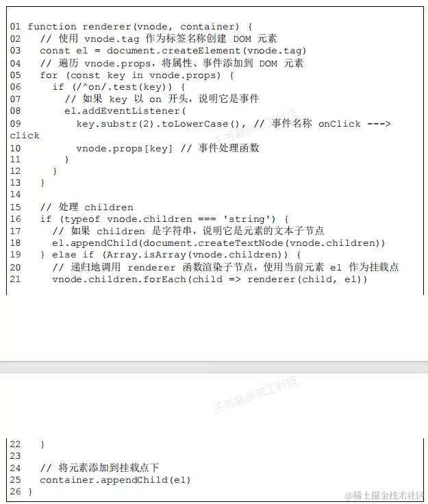 - 处理 children:如果 children 是一个数组,就递归地调用renderer 继续渲染,注意,此时我们要把刚刚创建的元素作为挂载点(父节点);如果 children 是字符串,则使用createTextNode 函数创建一个文本节点,并将其添加到新创建的元素内
