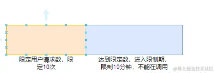 这种是最简单的限流算法,利用的是限定请求次数,每个用户建立一个计数器,从第一次请求的时候开始计数,当达到限定次数,就把改用户放入数据库或者缓存中,一定时间内不允许在调用,时间到期之后,恢复正常,达到限流效果。具体如图所示: