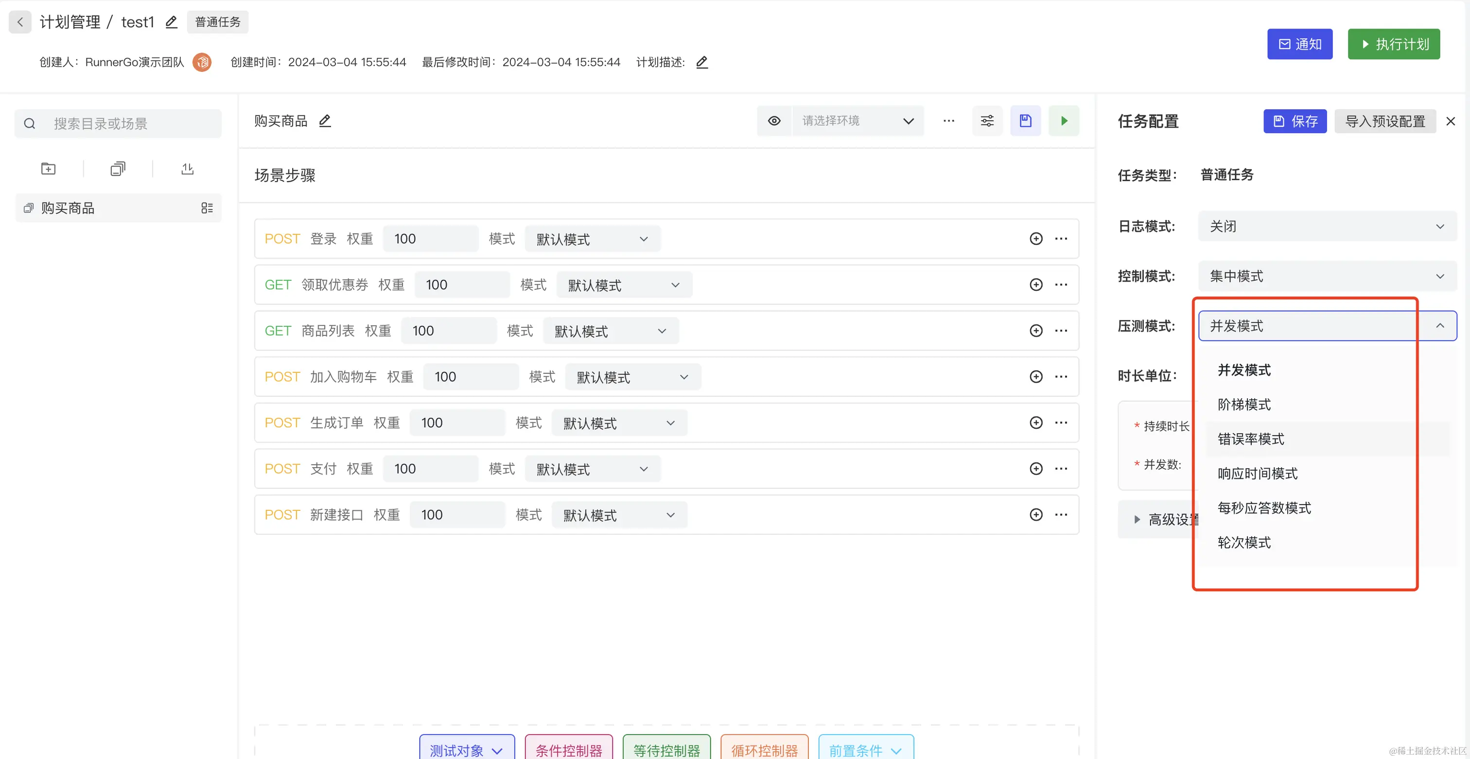 RunnerGo性能测试功能基于Go语言自研,性能更强、测试结果更准,且内置六大压测模式满足各类测试场景