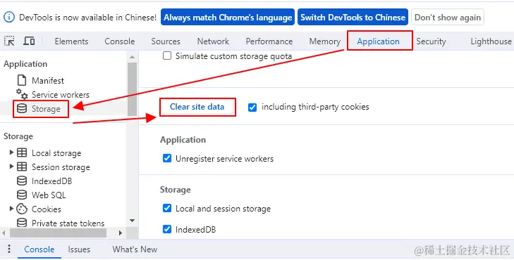 下面的横的一排页签上,找到应用(Application),在左侧的菜单里,找到存储(Storage),勾选包括第三方cookies(including third-party cookies), 点击清除网站数据(Clear site data)