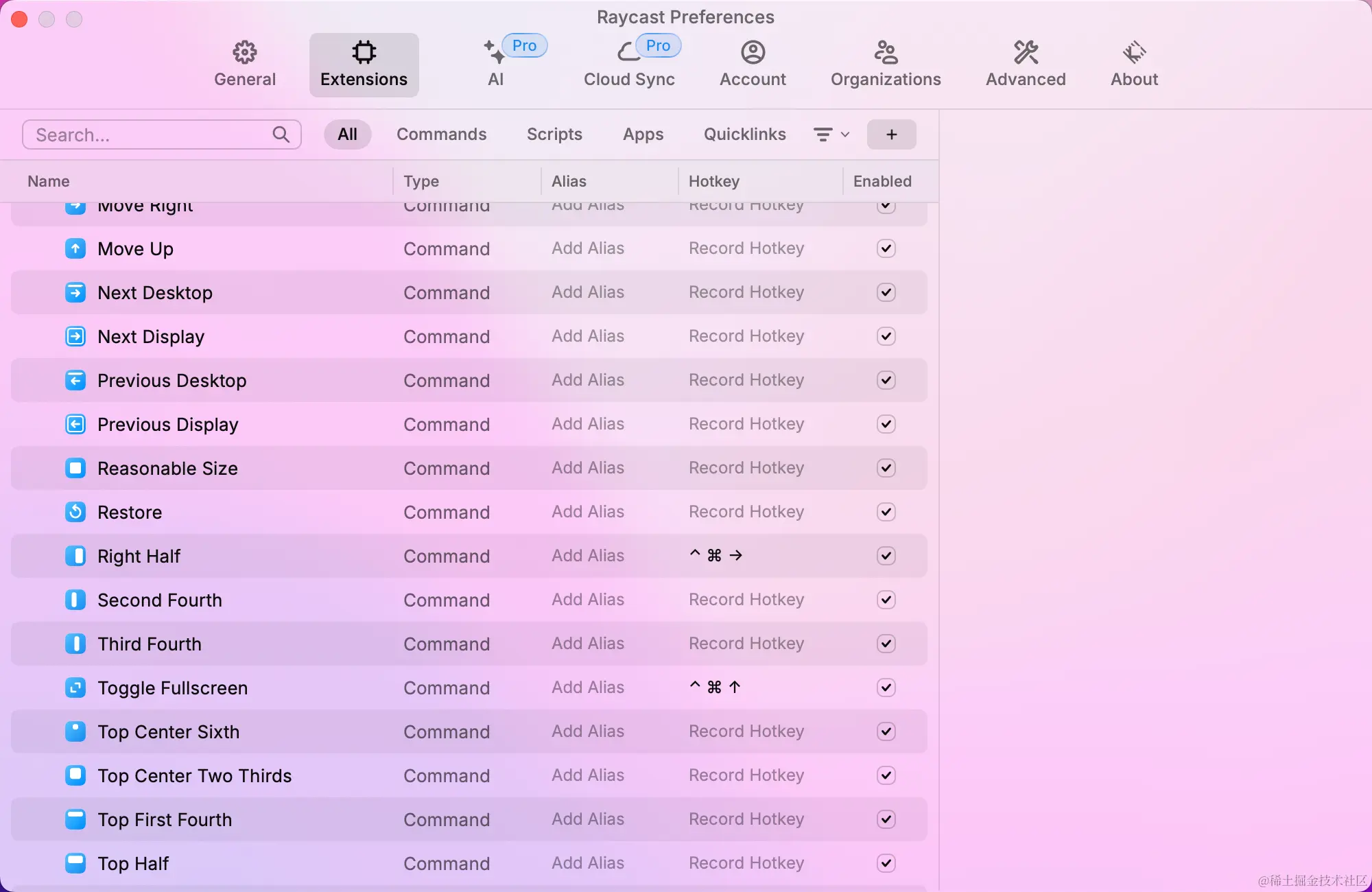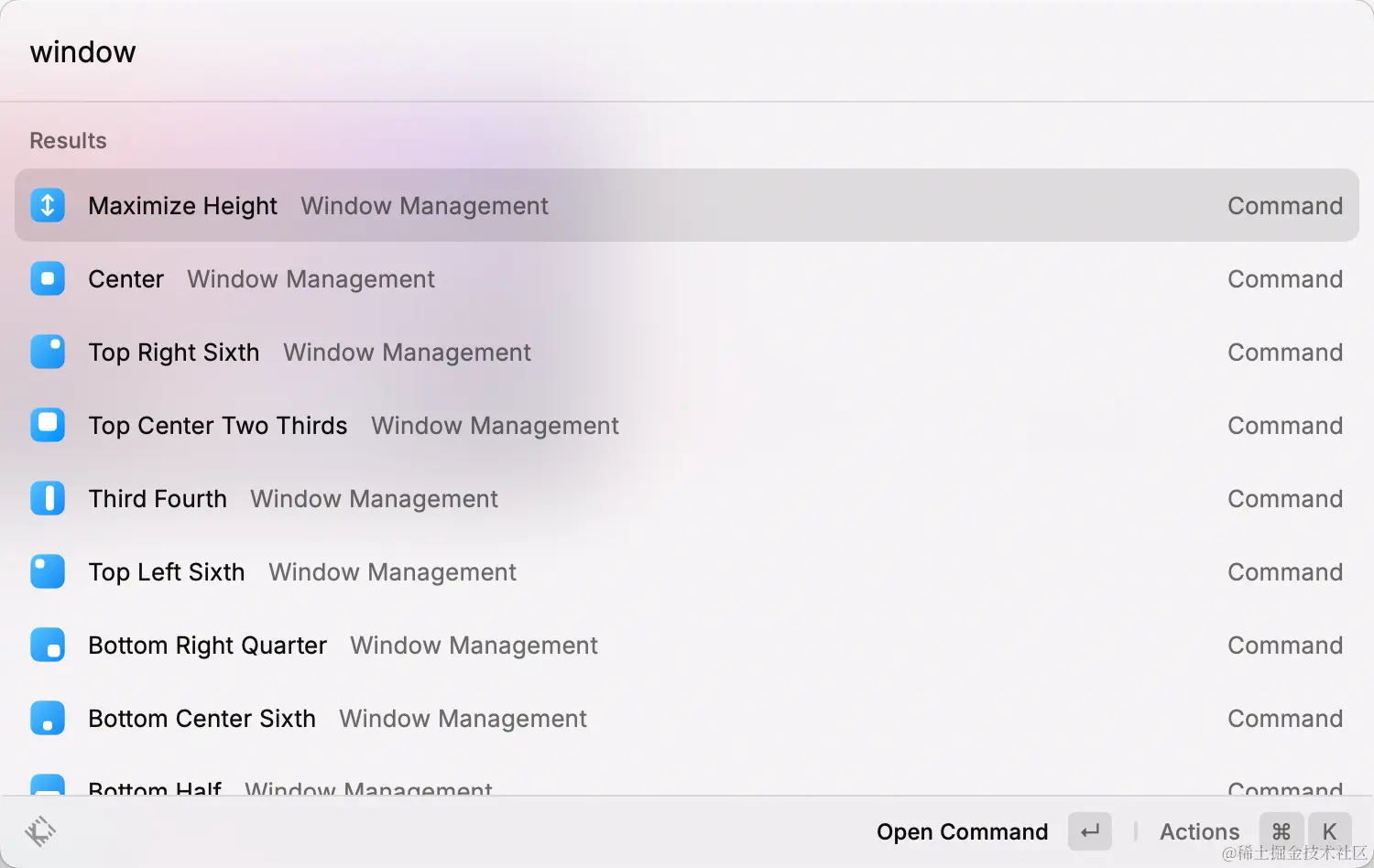 我们打开RayCast输入window,就可以看到有这么多可以设置window的选项了,我一般给常用的4个设置快捷键,分别如下