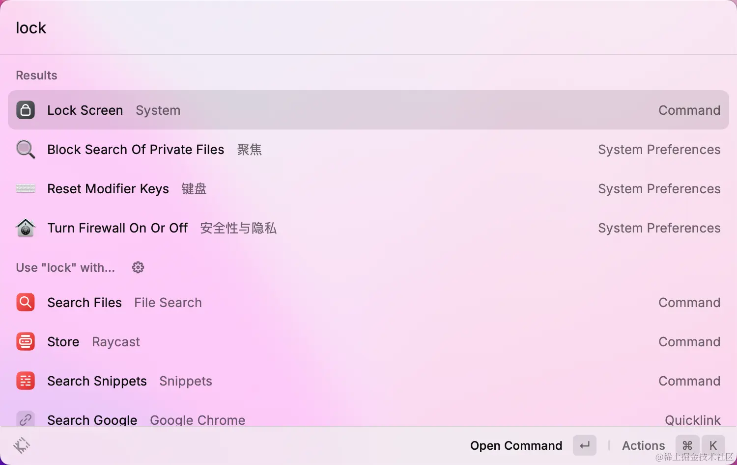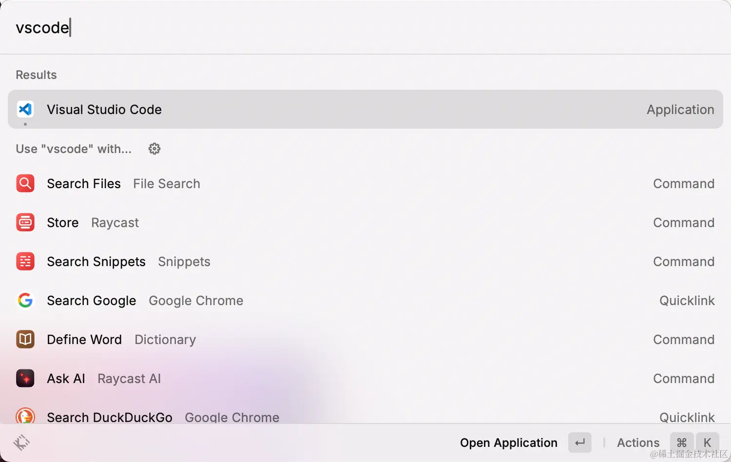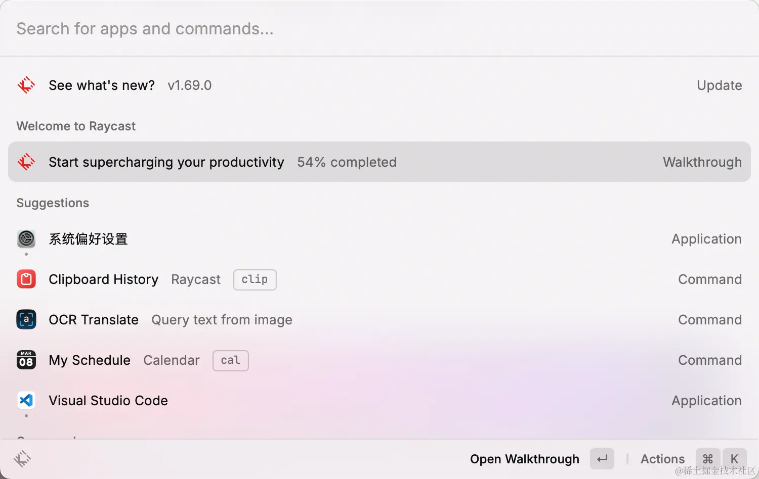 安装完,我们打开,会发现mac顶栏有一个新的图标,点击选择open Raycast即可打开。